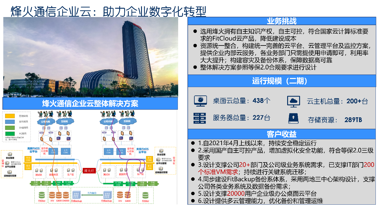 烽火通信科技股份有限公司是國(guó)際知名的信息通信網(wǎng)絡(luò)產(chǎn)品與解決方案提供商,國(guó)家科技部認(rèn)定的國(guó)內(nèi)光通信領(lǐng)域“863”計(jì)劃成果產(chǎn)業(yè)化基地和創(chuàng)新型企業(yè),烽火通信是信息化建設(shè)領(lǐng)域的國(guó)家隊(duì)。烽火通信企業(yè)云依據(jù)企業(yè)“一盤(pán)棋”思路,按照“統(tǒng)一規(guī)劃、分級(jí)建設(shè)、物理分散、邏輯集中”原則進(jìn)行整體規(guī)劃,構(gòu)建烽火“一朵云”。整體建設(shè)采用烽火FitCloud全棧云解決方案,按照統(tǒng)一門(mén)戶、統(tǒng)一服務(wù)、管理變革、價(jià)值提升、高效運(yùn)營(yíng)、智能運(yùn)維、彈性伸縮、異構(gòu)兼容的目標(biāo),打造數(shù)智“一朵云”。