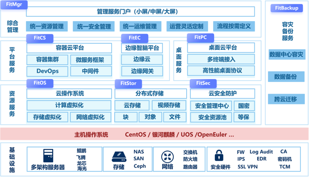 FitCloud烽火云涵蓋云平臺(tái)、分布式云存儲(chǔ)、超融合、云桌面、容器、云管平臺(tái)等多類具有自主知識(shí)產(chǎn)權(quán)的云產(chǎn)品,具備全面完善的云計(jì)算功能,能滿足多樣化的業(yè)務(wù)需求,為各類客戶提供安全、穩(wěn)定、便捷、易用的新一代IT基礎(chǔ)設(shè)施。