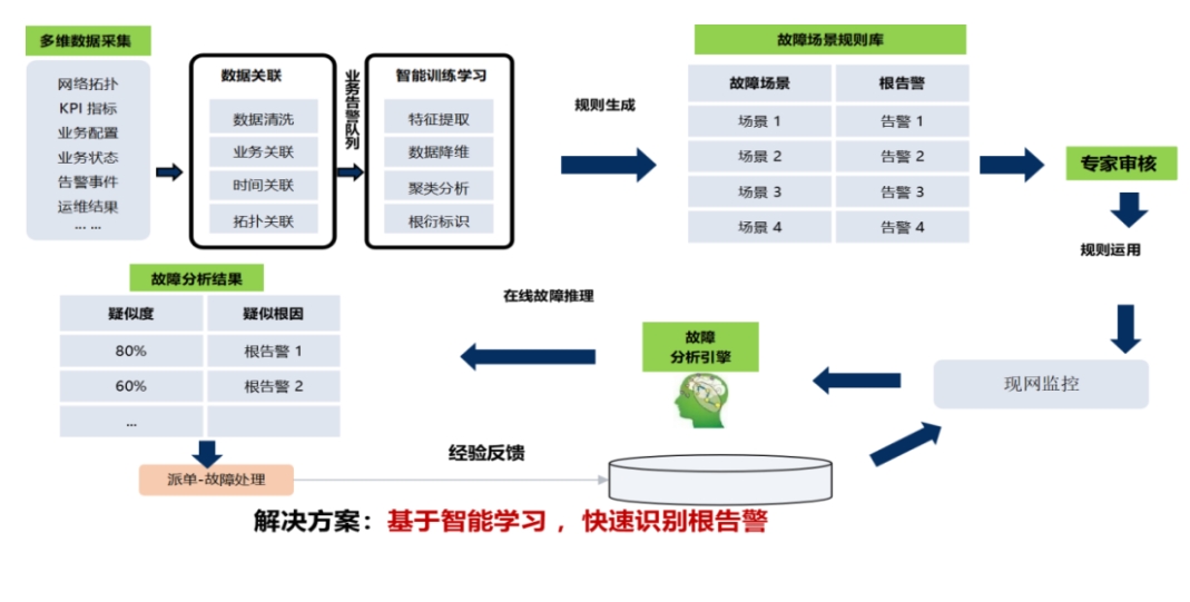 本次試點以遼寧聯(lián)通100G省內(nèi)干線作為試點網(wǎng)絡(luò),采用智能分析+專家經(jīng)驗的雙輪驅(qū)動策略,通過構(gòu)建智能云實現(xiàn)離線深度學(xué)習(xí)、剖析告警數(shù)據(jù)、精準(zhǔn)故障分類分級等,從而提升分析效率和準(zhǔn)確度。此外,系統(tǒng)還采用時空聚類技術(shù),可直接鎖定故障場景,精準(zhǔn)定位問題原因,使繁雜的海量告警變得可管可控,故障處理流程得到優(yōu)化,有效縮短處理時間,助力遼寧聯(lián)通100G省內(nèi)干線網(wǎng)絡(luò)告警壓降提升至80%-90%。