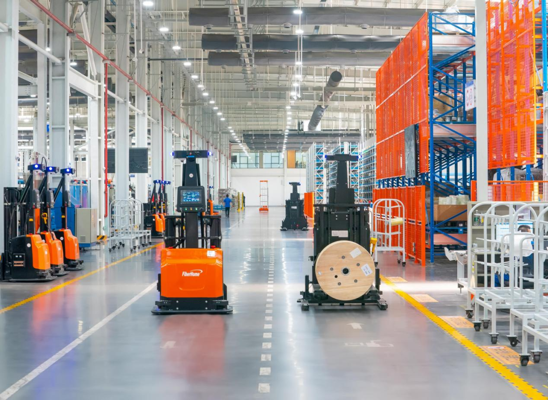 烽火通信數(shù)字工廠內(nèi),AGV無(wú)人車來(lái)回穿梭繁忙