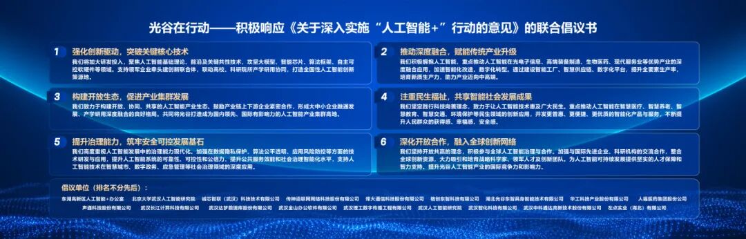 在論壇上,為積極響應(yīng)國(guó)務(wù)院《關(guān)于深入實(shí)施“人工智能+”行動(dòng)的意見(jiàn)》,東湖高新區(qū)人工智能+辦公室組織光谷的十七家企業(yè)和科研院所發(fā)布了“光谷在行動(dòng)”聯(lián)合倡議。該倡議的發(fā)布,既是光谷響應(yīng)國(guó)家 “人工智能+”戰(zhàn)略的堅(jiān)定表態(tài),更彰顯了光谷AI產(chǎn)業(yè)集群引領(lǐng)行業(yè)發(fā)展、助力數(shù)字中國(guó)建設(shè)的責(zé)任與擔(dān)當(dāng)。