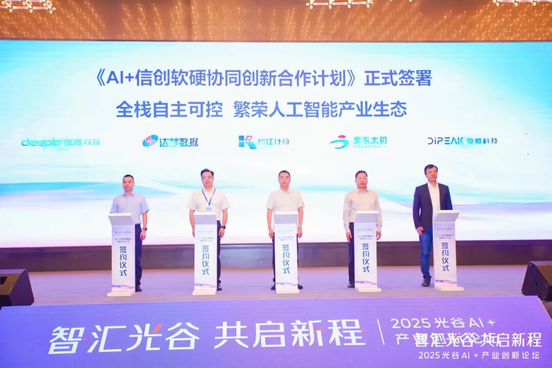 同時(shí),長(zhǎng)江計(jì)算、紫東太初、達(dá)夢(mèng)數(shù)據(jù)、深度科技、數(shù)巔科技攜手,正式啟動(dòng)了《AI+信創(chuàng)軟硬協(xié)同創(chuàng)新合作計(jì)劃》,旨在整合各方技術(shù)、資源與科研優(yōu)勢(shì),聯(lián)合開(kāi)展AI+信創(chuàng)領(lǐng)域的技術(shù)研發(fā)與創(chuàng)新,通過(guò)優(yōu)化資源配置、提升利用效率,共同構(gòu)建國(guó)產(chǎn)自主可控的人工智能產(chǎn)業(yè)一體化生態(tài),為光谷乃至全國(guó)AI+信創(chuàng)產(chǎn)業(yè)高質(zhì)量發(fā)展注入?yún)f(xié)同新動(dòng)能。