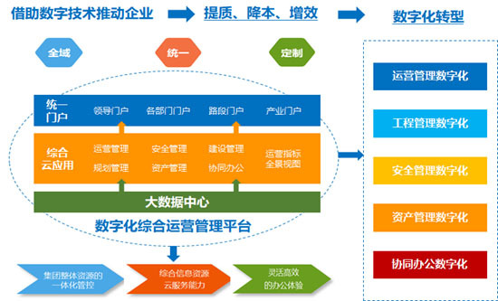 隨著我國交通強國建設(shè)步伐的加快,高速公路建設(shè)運營企業(yè)正處在數(shù)字化轉(zhuǎn)型發(fā)展的關(guān)鍵時期。由于高速企業(yè)機構(gòu)分散且產(chǎn)業(yè)眾多,存在一體化管控困難、信息互通滯后、數(shù)據(jù)難以共享、協(xié)同運轉(zhuǎn)效率低下等痛點,管理與運營難度不斷增大,傳統(tǒng)運營管理模式已經(jīng)跟不上數(shù)字經(jīng)濟的步伐。迫切需要借助云計算、大數(shù)據(jù)、互聯(lián)網(wǎng)等數(shù)字技術(shù)創(chuàng)新企業(yè)運營管理模式,推動企業(yè)的提質(zhì)、降本、增效,使企業(yè)向著集約化、精細化、科學(xué)化發(fā)展。