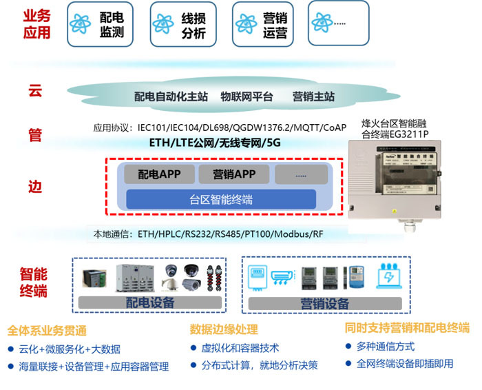 當(dāng)前,為解決低壓配電網(wǎng)中長期存在配電臺區(qū)狀態(tài)感知難、線路運維效率低、用戶需求側(cè)管理混亂的痛點,烽火積極跟進國網(wǎng)需求,按照智慧電力物聯(lián)網(wǎng)“云-管-邊-端”的整體架構(gòu),推出臺區(qū)智能終端產(chǎn)品,即定位為配電自動化邊緣側(cè)設(shè)備。遠(yuǎn)程上主要通過以太網(wǎng)或廣域無線網(wǎng)絡(luò)連接到物聯(lián)管理平臺、營銷主站、配電自動化主站或其他業(yè)務(wù)系統(tǒng);本地則通過無線通信網(wǎng)絡(luò)、有線網(wǎng)絡(luò)支持各協(xié)議類型、各業(yè)務(wù)終端和傳感器的即插、即連、即用,實現(xiàn)感知層的通信匯聚、邊緣計算和區(qū)域自治。