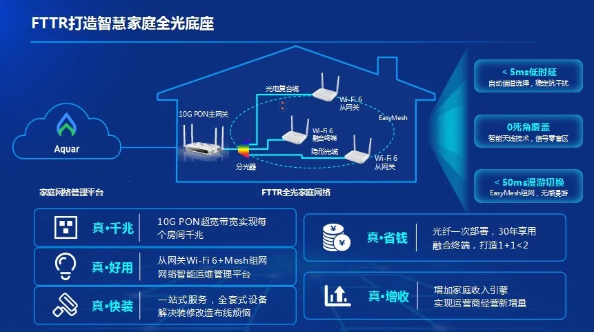 FTTR解決方案支持EasyMesh無線組網(wǎng)功能,主、從網(wǎng)關(guān)Wi-Fi設(shè)置自動同步,采用信道敏捷選擇、智能抗干擾和漫游優(yōu)化等AI智能算法,結(jié)合合理的網(wǎng)關(guān)布局,可實(shí)現(xiàn)無線覆蓋不遺漏、漫游千兆不減速、信道切換不抖動、Wi-Fi強(qiáng)度不降低、游戲視頻不卡頓,給用戶帶來高帶寬低時(shí)延的極致體驗(yàn)。