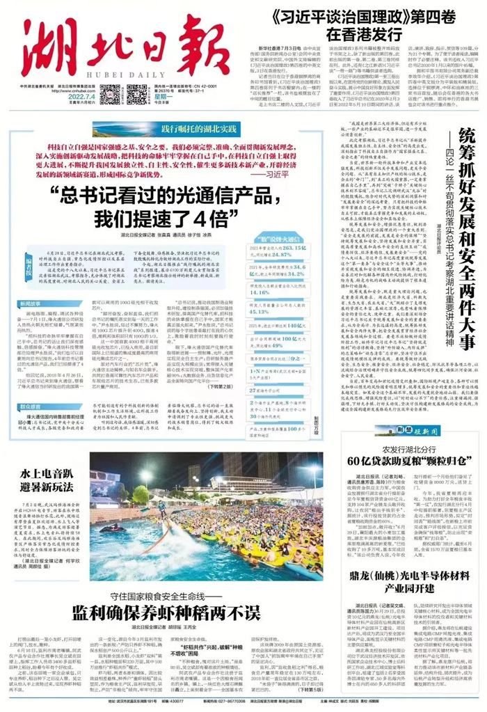 7月4日,《湖北日報》頭版刊發(fā)《“總書記看過的光通信產(chǎn)品,我們提速了4倍”》,聚焦烽火通信始終牢記總書記的殷切囑托,堅持科技自立自強的道路不動搖。