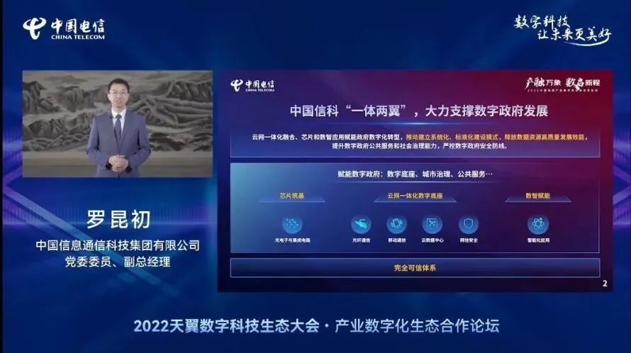 在大會同期舉辦的產(chǎn)業(yè)數(shù)字化生態(tài)合作論壇上,中國信科集團黨委委員、副總經(jīng)理羅昆初發(fā)表了《以數(shù)字政府為紐帶,構(gòu)筑和人民群眾更牢固更多元的數(shù)字聯(lián)接》的主題演講,分享中國信科在數(shù)字政府領域的趨勢洞察和實踐應用。