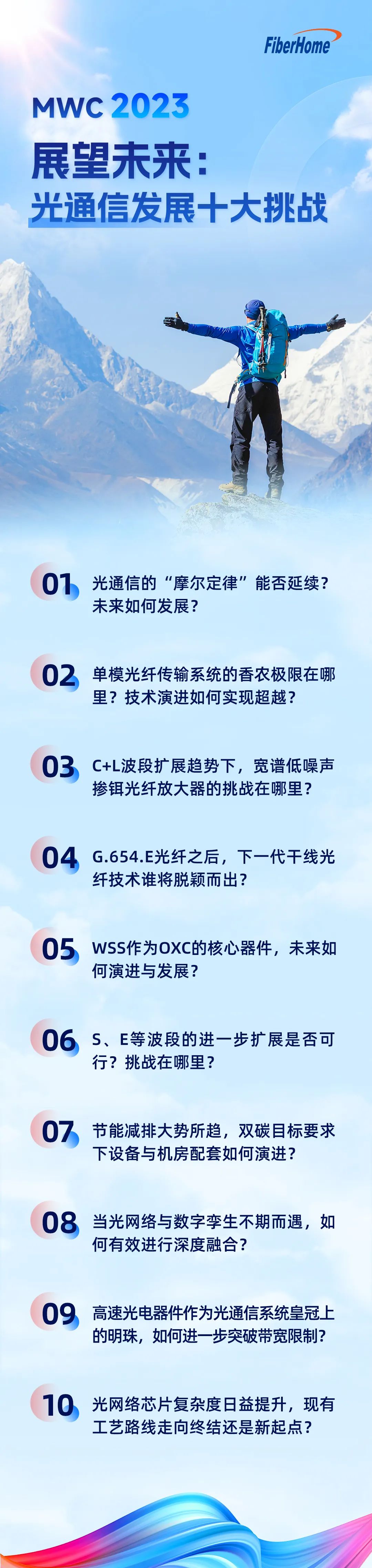 站在2023年又一新起點(diǎn),展望未來。烽火通信提出光通信面臨的十大挑戰(zhàn),愿與運(yùn)營商及行業(yè)客戶、產(chǎn)業(yè)鏈合作伙伴攜手創(chuàng)新,繼續(xù)勇攀光通信發(fā)展高峰!