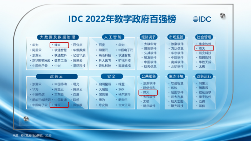 近日,國(guó)際權(quán)威咨詢(xún)機(jī)構(gòu)IDC發(fā)布《2022年數(shù)字政府百?gòu)?qiáng)榜》,該榜單根據(jù)2022年IDC政府行業(yè)組在數(shù)字政府領(lǐng)域的研究,評(píng)估了技術(shù)提供商的市場(chǎng)能力及市場(chǎng)份額,涵蓋十個(gè)技術(shù)領(lǐng)域模塊。其中,烽火進(jìn)入大數(shù)據(jù)及數(shù)據(jù)治理、政務(wù)云、社會(huì)管理、公共服務(wù)四大模塊榜單。