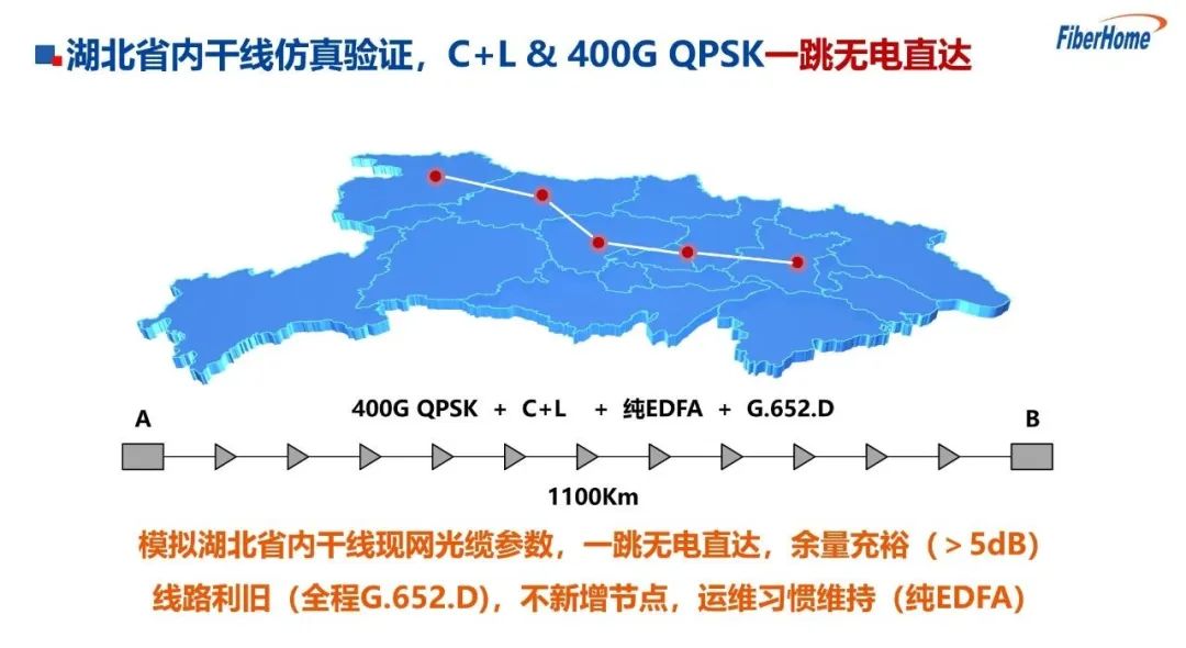 烽火通信基于湖北省內(nèi)干線網(wǎng)絡光纜數(shù)據(jù),采用C+L波段和400G QPSK技術進行了現(xiàn)網(wǎng)長跨段模擬測試。實驗中,烽火通信實現(xiàn)了環(huán)回1100km的傳輸距離驗證,系統(tǒng)的余量超過5dB,線路利舊(全程G.652.D),且不新增節(jié)點,全程采用EDFA,系統(tǒng)性驗證了在維持現(xiàn)有網(wǎng)絡結構、維持現(xiàn)有運維習慣、維持主流光纜類型的情況下,400G QPSK可以滿足干線網(wǎng)絡的傳輸性能要求。