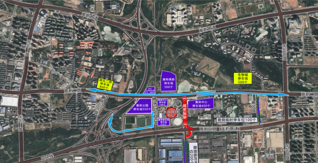 高新二路西向東車輛(奧體中心360停車場、高新二路南側臨時停車泊位、奧風路臨時停車泊位),引導至光谷三路進入高新大道駛入三環(huán)線或雄楚高架。