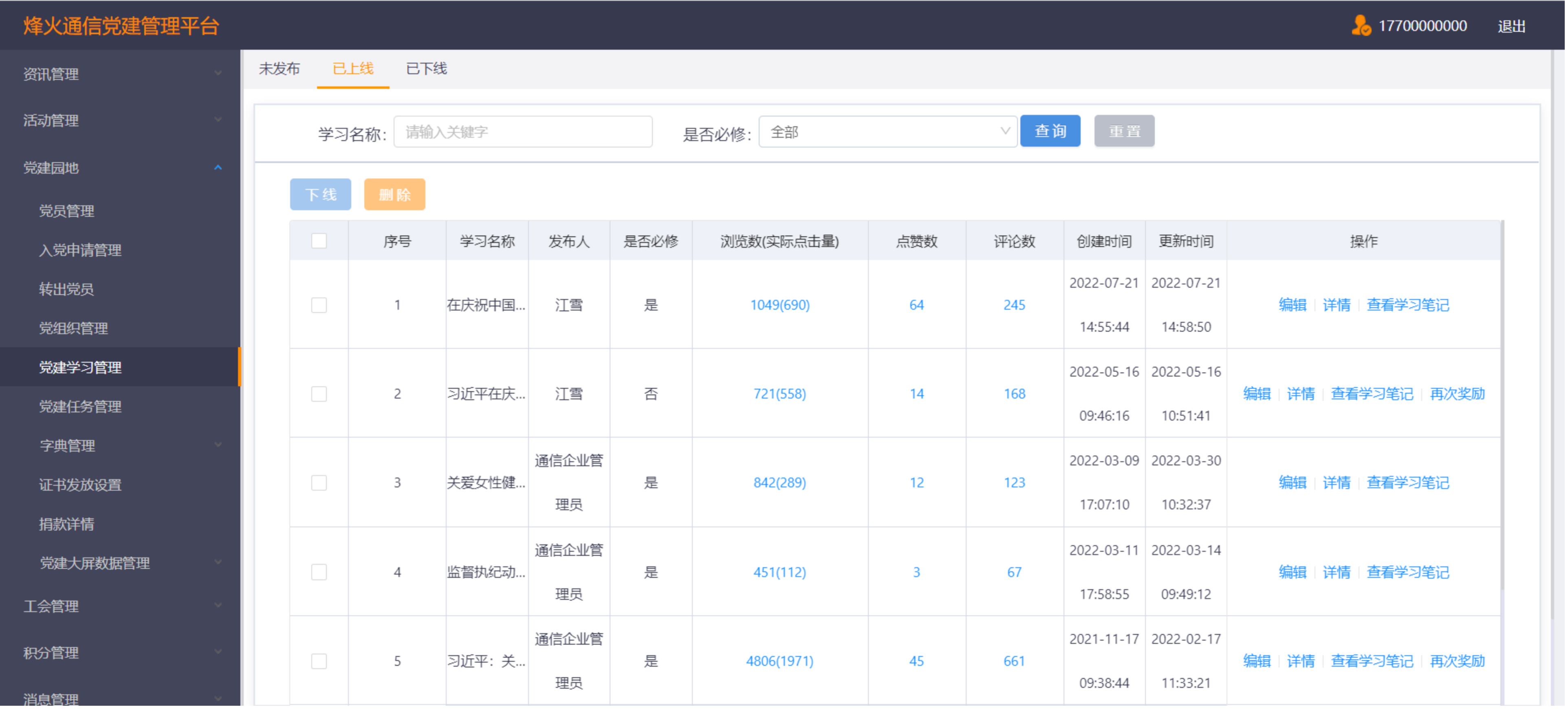 烽火智慧黨建平臺(tái)是端到端的解決方案,由手機(jī)APP、web端、PC網(wǎng)頁(yè)版和運(yùn)營(yíng)管理平臺(tái)組成。遵循“黨建上網(wǎng),重心下沉”的工作思路,基于統(tǒng)一建設(shè)的基礎(chǔ)設(shè)施、統(tǒng)一的數(shù)據(jù)中臺(tái)、統(tǒng)一的業(yè)務(wù)標(biāo)準(zhǔn)規(guī)范體系,打造集“黨務(wù)工作、黨建活動(dòng)、教育學(xué)習(xí)、宣傳服務(wù)、考核展示”五大功能于一體的智慧黨建平臺(tái),讓黨建工作規(guī)范化、數(shù)據(jù)化、智能化、高效化。